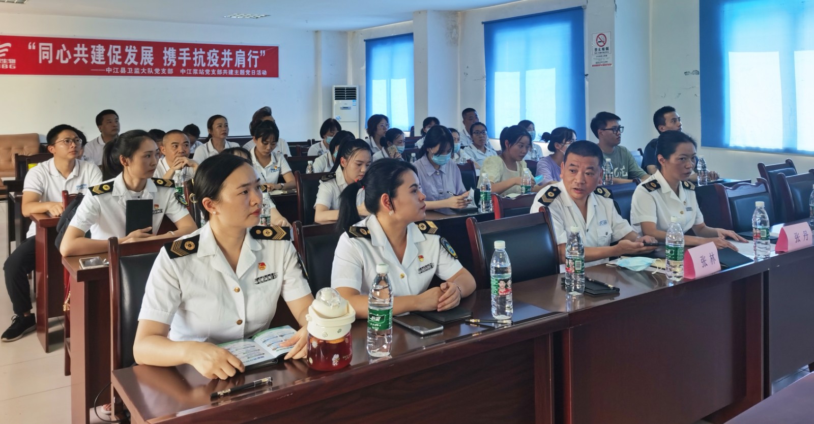 近日,中江漿站黨支部與中江縣衛監大隊黨支部聯合開展“同心共建促發展 攜手抗疫并肩行”主題黨日活動。雙方黨員、入黨積極分子、漿站班子成員及員工代表30余人參加活動。