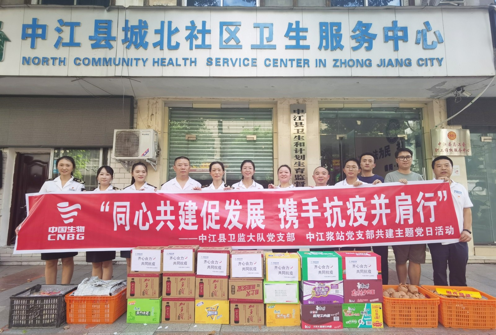后中江漿站黨員代表隨黨支部書記、總經理陳麗霞前往中江縣衛生監督執法大隊,向連日以來冒著酷暑堅守崗位的一線基層執法工作者送去慰問品。